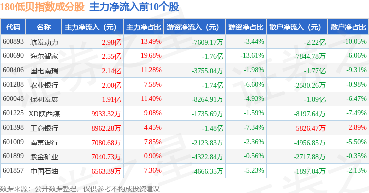 资金流向方面,180低贝(000136)指数成份股当日主力资金净流入合计11.43亿元,游资资金净流出合计10.18亿元,散户资金净流出合计1.25亿元。成份股资金流向详情见下表: