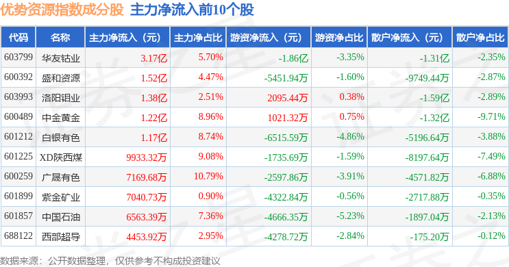 资金流向方面,优势资源(000145)指数成份股当日主力资金净流出合计1.81亿元,游资资金净流出合计1.01亿元,散户资金净流入合计2.82亿元。成份股资金流向详情见下表: