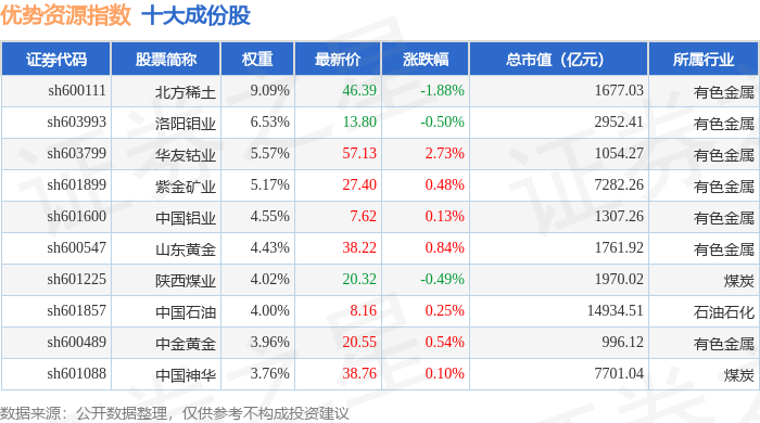优势资源(000145)指数十大成份股详情如下:
