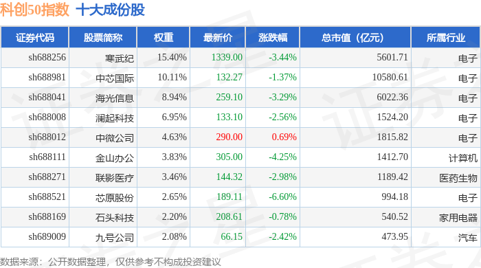 科创50(000688)指数十大成份股详情如下: