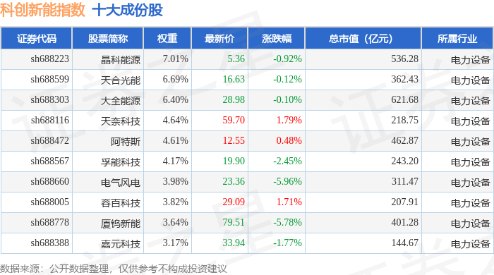 科创新能(000692)指数十大成份股详情如下: