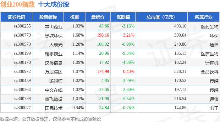 证券之星消息,9月26日,创业200(399019)指数报收于4392.16点,跌2.39%,成交1095.24亿元,换手率4.22%。当日该指数成份股中,上涨的有32家,易成新能以20.1%的涨幅领涨,下跌的有166家,无线传媒以10.82%的跌幅领跌。