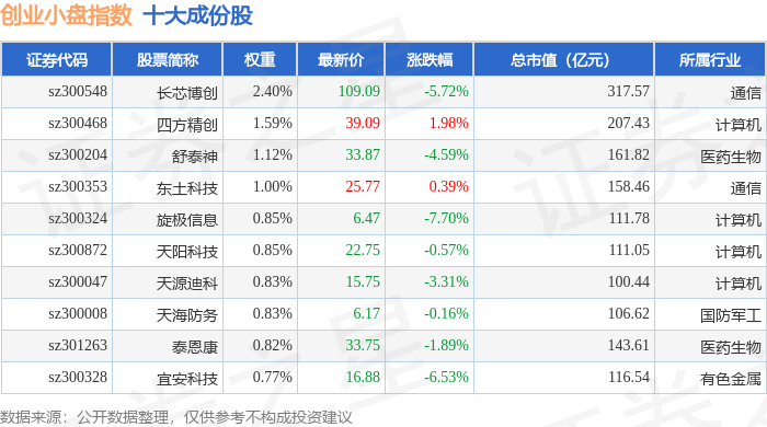 证券之星消息,9月26日,创业小盘(399020)指数报收于1732.35点,跌2.29%,成交854.33亿元,换手率4.2%。当日该指数成份股中,上涨的有48家,华自科技以15.44%的涨幅领涨,下跌的有247家,初灵信息以10.2%的跌幅领跌。