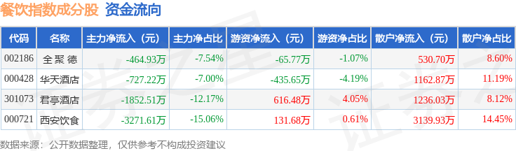 资金流向方面,餐饮指数(399238)成份股当日主力资金净流出合计6316.26万元,游资资金净流入合计246.73万元,散户资金净流入合计6069.53万元。成份股资金流向详情见下表: