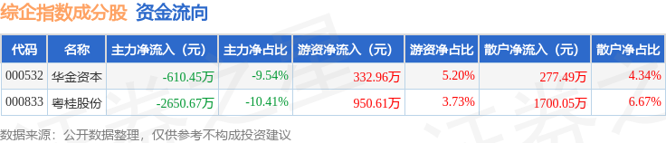 资金流向方面,综企指数(399249)成份股当日主力资金净流出合计3261.12万元,游资资金净流入合计1283.57万元,散户资金净流入合计1977.55万元。成份股资金流向详情见下表: