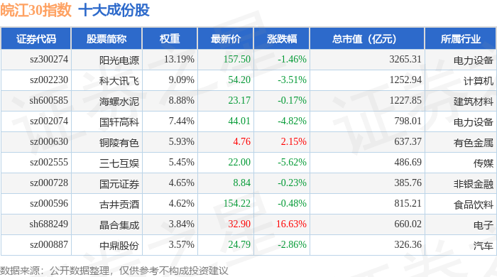 皖江30(399350)指数十大成份股详情如下:
