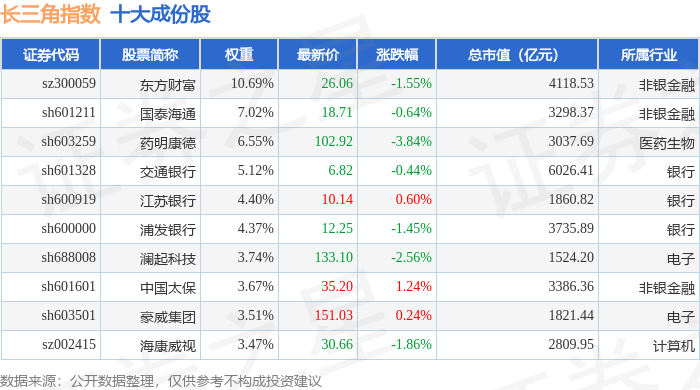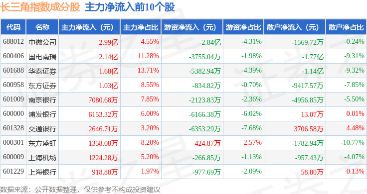 资金流向方面,长三角(399355)指数成份股当日主力资金净流出合计29.37亿元,游资资金净流入合计7.8亿元,散户资金净流入合计21.58亿元。成份股资金流向详情见下表: