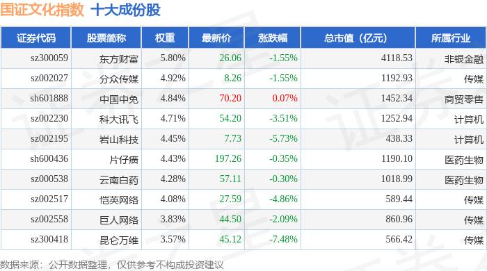 证券之星消息,9月26日,国证文化(399397)指数报收于2391.66点,跌2.69%,成交556.67亿元,换手率3.18%。当日该指数成份股中,上涨的有10家,华侨城A以1.19%的涨幅领涨,下跌的有39家,无线传媒以10.82%的跌幅领跌。