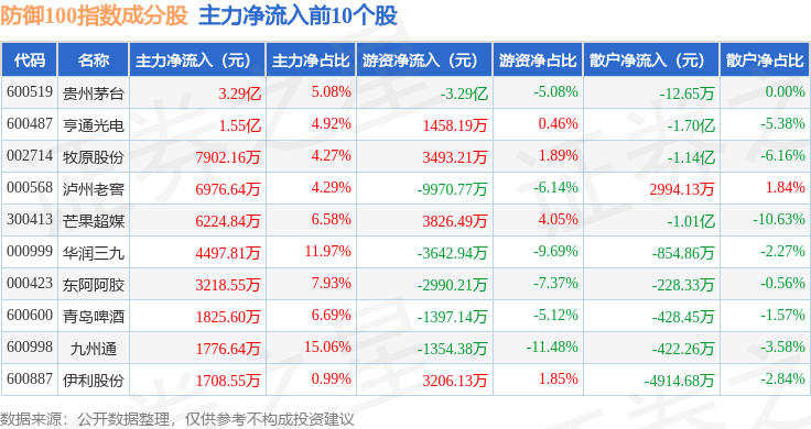资金流向方面,防御100(399403)指数成份股当日主力资金净流出合计41.59亿元,游资资金净流入合计16.43亿元,散户资金净流入合计25.17亿元。成份股资金流向详情见下表: