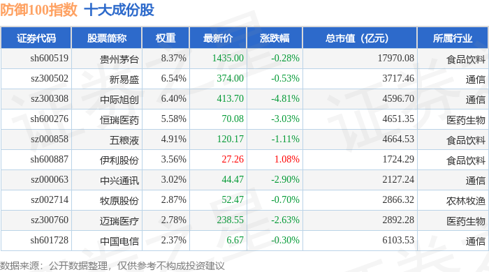 防御100(399403)指数十大成份股详情如下: