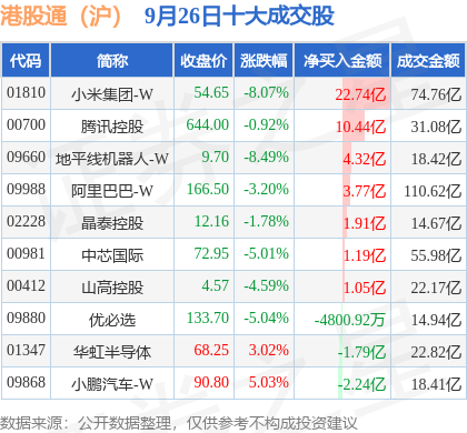 证券之星消息,9月26日,恒生指数跌1.35%,报收26128.2点。当日南向资金净买入105.405亿港元,交易所公布的港股通(沪)十大成交股中,净买入个股共7只,净买入金额最多的是小米集团-W,净买入22.74亿港元,净卖出个股共3只,净卖出金额最多的是小鹏汽车-W,净卖出2.24亿港元。详情可见下表: