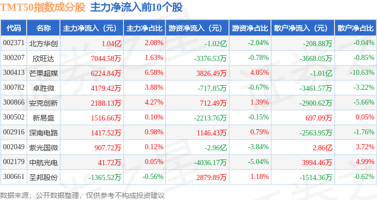 资金流向方面,TMT50(399610)指数成份股当日主力资金净流出合计185.95亿元,游资资金净流入合计56.46亿元,散户资金净流入合计129.49亿元。成份股资金流向详情见下表: