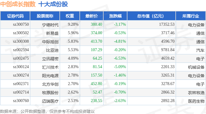 中创成长(399626)指数十大成份股详情如下: