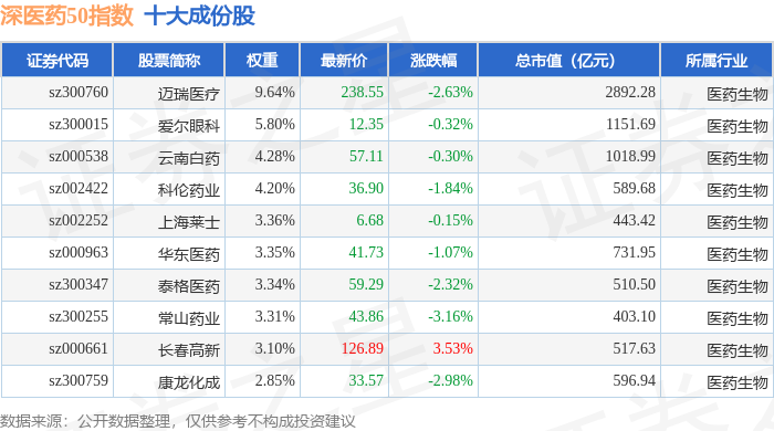 深医药50(399647)指数十大成份股详情如下: