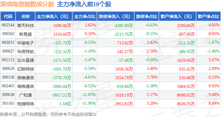 资金流向方面,深成电信(399688)指数成份股当日主力资金净流出合计28.02亿元,游资资金净流入合计10.98亿元,散户资金净流入合计17.04亿元。成份股资金流向详情见下表: