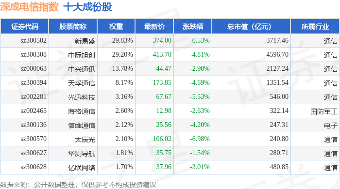 证券之星消息,9月26日,深成电信(399688)指数报收于5495.05点,跌3.12%,成交560.88亿元,换手率4.15%。当日该指数成份股中,下跌的有15家,太辰光以6.98%的跌幅领跌。