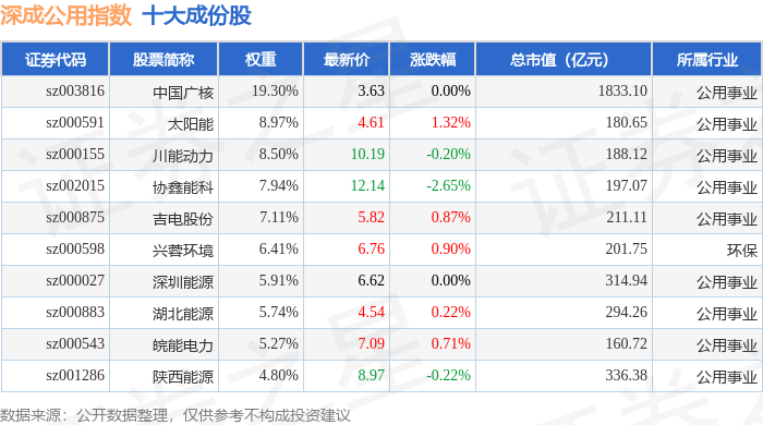 证券之星消息,9月26日,深成公用(399689)指数报收于834.55点,涨0.25%,成交33.32亿元,换手率0.58%。当日该指数成份股中,上涨的有10家,龙源电力以3.26%的涨幅领涨,下跌的有4家,协鑫能科以2.65%的跌幅领跌。