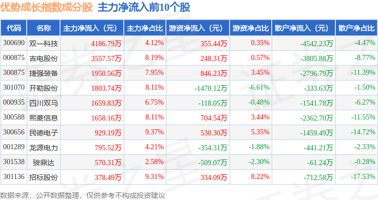 资金流向方面,优势成长(399698)指数成份股当日主力资金净流出合计5.27亿元,游资资金净流入合计2.64亿元,散户资金净流入合计2.63亿元。成份股资金流向详情见下表:
