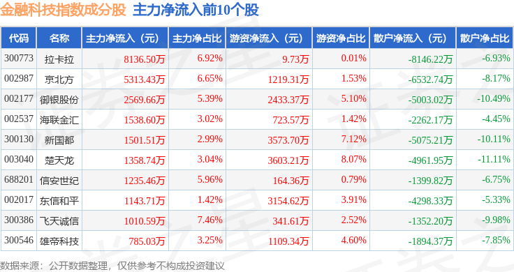 资金流向方面,金融科技(399699)指数成份股当日主力资金净流出合计64.01亿元,游资资金净流入合计24.25亿元,散户资金净流入合计39.76亿元。成份股资金流向详情见下表: