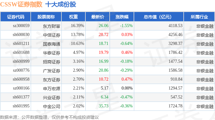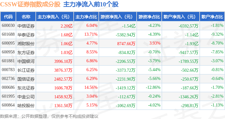 资金流向方面,CSSW证券(399707)指数成份股当日主力资金净流出合计6.18亿元,游资资金净流入合计1.86亿元,散户资金净流入合计4.32亿元。成份股资金流向详情见下表: