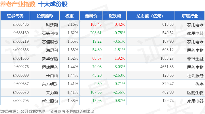资金流向方面,养老产业(399812)指数成份股当日主力资金净流出合计11.03亿元,游资资金净流入合计3.49亿元,散户资金净流入合计7.54亿元。成份股资金流向详情见下表: