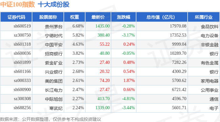 证券之星消息,9月26日,中证100(399903)指数报收于4394.88点,跌1.09%,成交3306.72亿元,换手率0.68%。当日该指数成份股中,上涨的有37家,紫光国微以5.95%的涨幅领涨,下跌的有60家,立讯精密以6.53%的跌幅领跌。