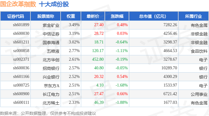证券之星消息,9月26日,国企改革(399974)指数报收于1874.4点,跌0.44%,成交1791.95亿元,换手率0.82%。当日该指数成份股中,上涨的有48家,紫光国微以5.95%的涨幅领涨,下跌的有49家,生益科技以5.89%的跌幅领跌。