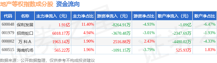资金流向方面,地产等权(399983)指数成份股当日主力资金净流入合计2.77亿元,游资资金净流出合计1.05亿元,散户资金净流出合计1.72亿元。成份股资金流向详情见下表:
