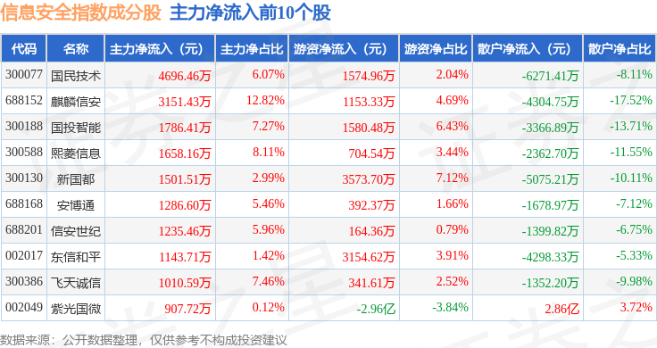 资金流向方面,信息安全(399994)指数成份股当日主力资金净流出合计58.57亿元,游资资金净流入合计15.77亿元,散户资金净流入合计42.8亿元。成份股资金流向详情见下表: