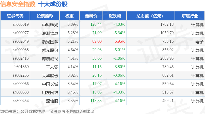 证券之星消息,9月26日,信息安全(399994)指数报收于1945.19点,跌2.92%,成交726.98亿元,换手率3.84%。当日该指数成份股中,上涨的有5家,紫光国微以5.95%的涨幅领涨,下跌的有58家,旋极信息以7.7%的跌幅领跌。