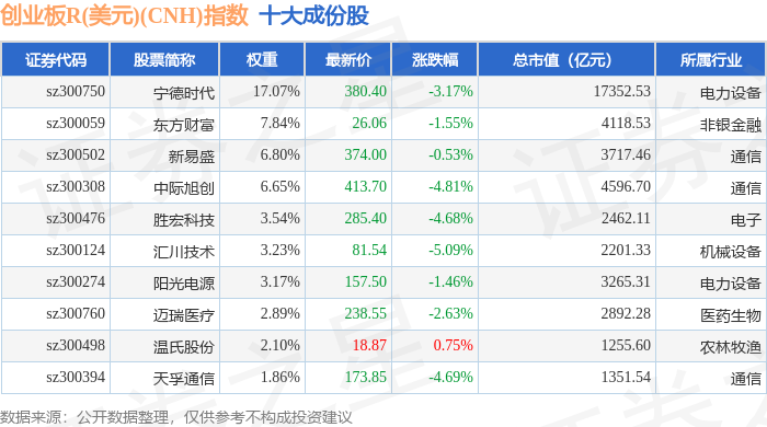 创业板R(美元)(CNH)(470007)指数十大成份股详情如下: