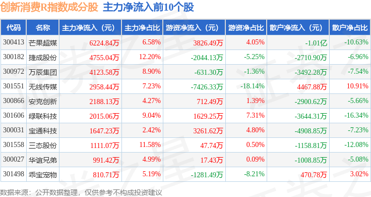 资金流向方面,创新消费R(470041)指数成份股当日主力资金净流出合计20.67亿元,游资资金净流入合计7.27亿元,散户资金净流入合计13.4亿元。成份股资金流向详情见下表: