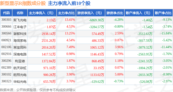 资金流向方面,新型显示R(470048)指数成份股当日主力资金净流出合计76.88亿元,游资资金净流入合计16.54亿元,散户资金净流入合计60.34亿元。成份股资金流向详情见下表: