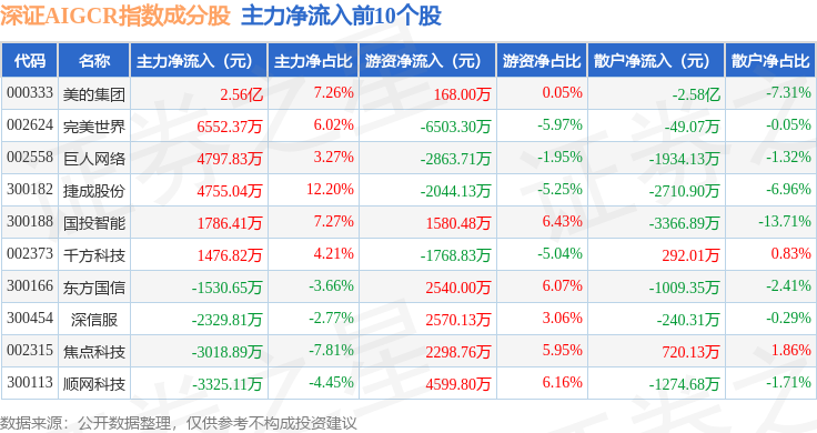 资金流向方面,深证AIGCR(470075)指数成份股当日主力资金净流出合计64.26亿元,游资资金净流入合计25.51亿元,散户资金净流入合计38.75亿元。成份股资金流向详情见下表: