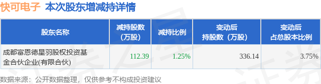 证券之星消息,9月26日快可电子发布公告《快可电子:关于股东股份减持计划实施完成的公告》,其股东成都富恩德星羽股权投资基金合伙企业(有限合伙)于2025年9月17日至2025年9月25日间合计减持112.39万股,占公司目前总股本的1.2528%,变动期间该股股价下跌6.06%,截止9月25日收盘报32.99元。