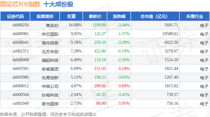 证券之星消息,9月26日,国证芯片R(480017)指数报收于14670.54点,跌1.36%,成交1195.27亿元,换手率3.65%。当日该指数成份股中,上涨的有10家,晶合集成以16.63%的涨幅领涨,下跌的有19家,瑞芯微以6.75%的跌幅领跌。