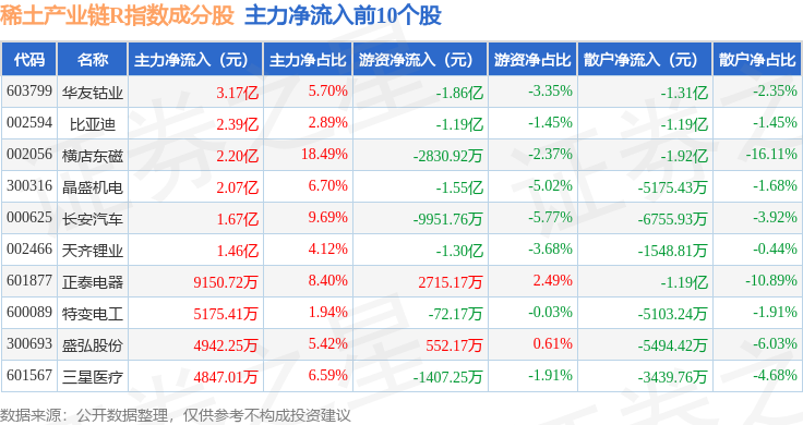 资金流向方面,稀土产业链R(489013)指数成份股当日主力资金净流出合计33.55亿元,游资资金净流入合计7.82亿元,散户资金净流入合计25.73亿元。成份股资金流向详情见下表: