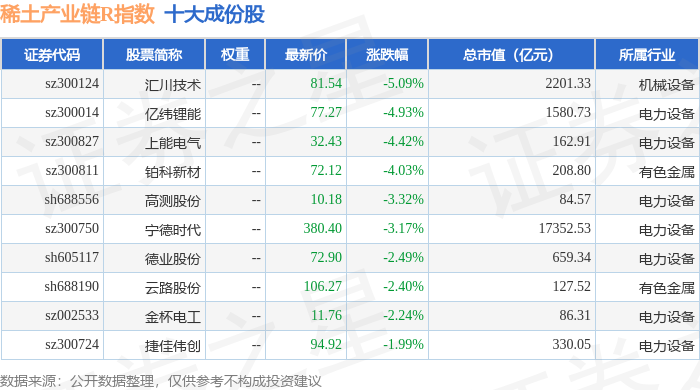 证券之星消息,9月26日,稀土产业链R(489013)指数报收于3882.08点,跌1.28%,成交983.86亿元,换手率2.49%。当日该指数成份股中,上涨的有21家,晶盛机电以12.8%的涨幅领涨,下跌的有29家,汇川技术以5.09%的跌幅领跌。