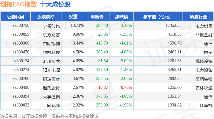 创指ESG(970028)指数十大成份股详情如下: