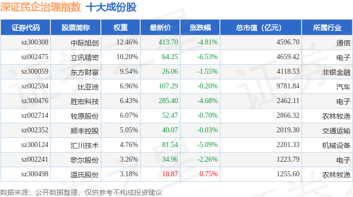 深证民企治理(970058)指数十大成份股详情如下: