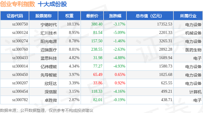 创业专利(970068)指数十大成份股详情如下: