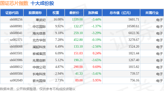 证券之星消息,9月26日,国证芯片(980017)指数报收于13474.31点,跌1.37%,成交1195.27亿元,换手率3.65%。当日该指数成份股中,上涨的有10家,晶合集成以16.63%的涨幅领涨,下跌的有19家,瑞芯微以6.75%的跌幅领跌。