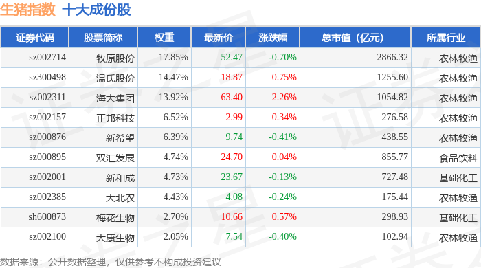 生猪指数(980073)十大成份股详情如下: