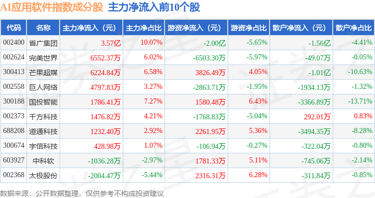 资金流向方面,AI应用软件(980107)指数成份股当日主力资金净流出合计46.37亿元,游资资金净流入合计17.38亿元,散户资金净流入合计28.98亿元。成份股资金流向详情见下表: