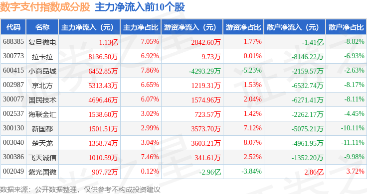 资金流向方面,数字支付(980113)指数成份股当日主力资金净流出合计19.98亿元,游资资金净流入合计6.07亿元,散户资金净流入合计13.91亿元。成份股资金流向详情见下表: