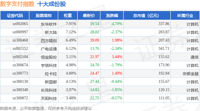 证券之星消息,9月26日,数字支付(980113)指数报收于1916.91点,跌1.23%,成交397.18亿元,换手率3.59%。当日该指数成份股中,上涨的有10家,紫光国微以5.95%的涨幅领涨,下跌的有40家,润和软件以4.99%的跌幅领跌。