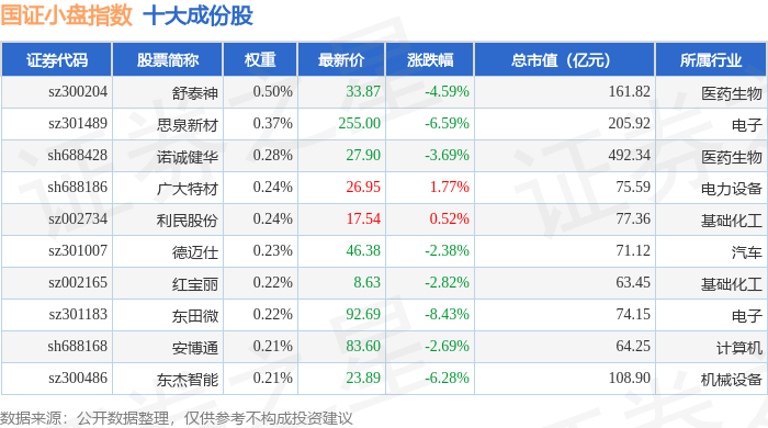 证券之星消息,9月26日,国证小盘(980202)指数报收于1723.05点,跌0.92%,成交1751.44亿元,换手率3.39%。当日该指数成份股中,上涨的有545家,芳源股份以20.04%的涨幅领涨,下跌的有900家,果麦文化以13.91%的跌幅领跌。