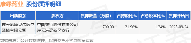 证券之星消息,康缘药业(600557)9月26日公开信息显示,股东连云港康贝尔医疗器械有限公司向中国银行股份有限公司连云港高新区支行合计质押700.0万股,占总股本1.24%。质押详情见下表: