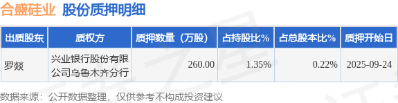 证券之星消息,合盛硅业(603260)9月26日公开信息显示,股东罗燚向兴业银行股份有限公司乌鲁木齐分行合计质押260.0万股,占总股本0.22%。质押详情见下表: