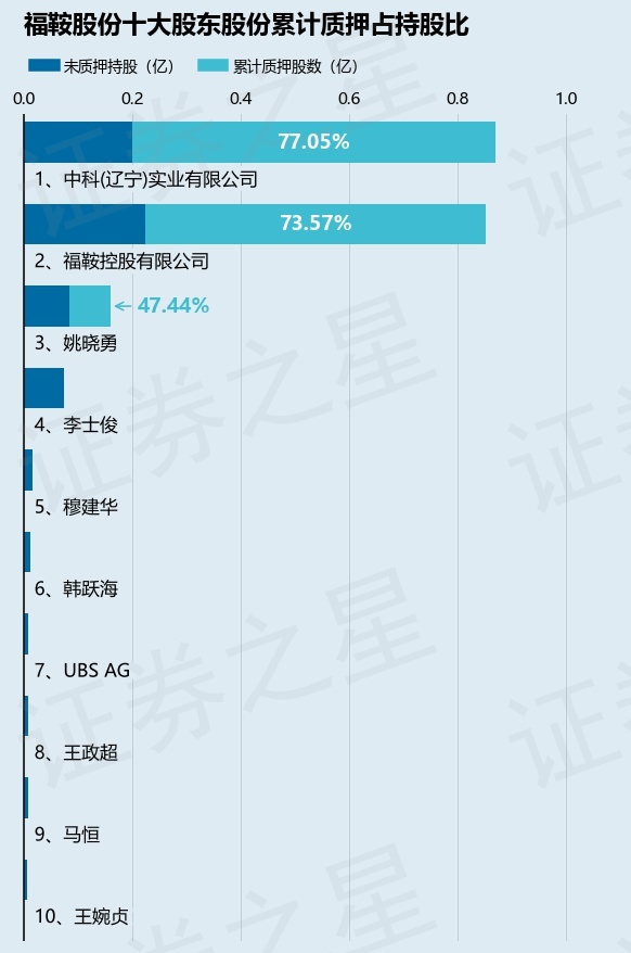 截止本公告日,股东中科(辽宁)实业有限公司已累计质押股份6709.1万股,占其持股总数的77.05%,股东福鞍控股有限公司已累计质押股份6278.0万股,占其持股总数的73.57%,股东姚晓勇已累计质押股份760.0万股,占其持股总数的47.44%。本次质押后福鞍股份十大股东的累计质押股份占持股比例(占持股比例的计算以公司最新一期财务报表公布的十大股东的持股总数为基准)见下图: